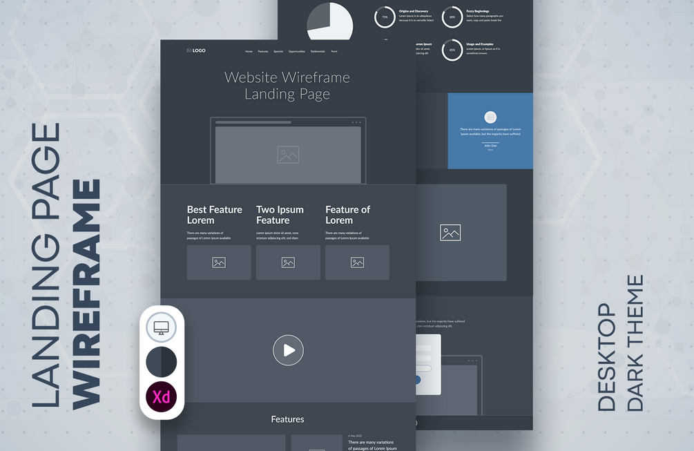Wireframe landing page dark theme design. One page website desktop layout template.