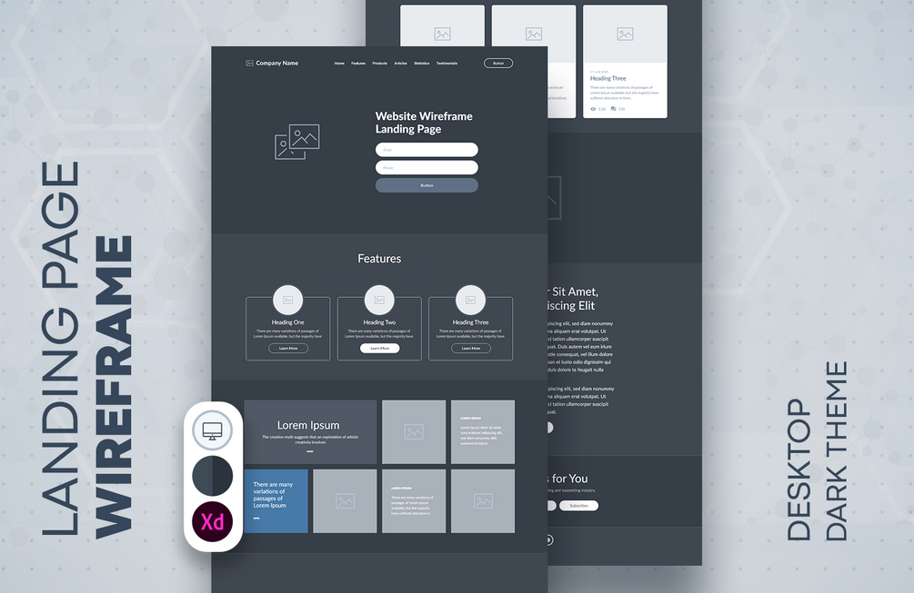 Wireframe landing page dark theme. One page website template.