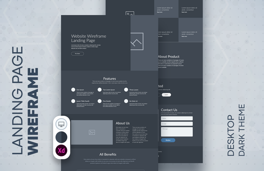 Landing page wireframe resource for Adobe XD. Marketing one page website dark theme template.