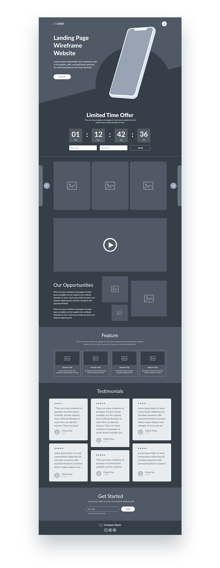 Landing page wireframe design. Desktop option. Light and Dark theme. One page website layout template.
