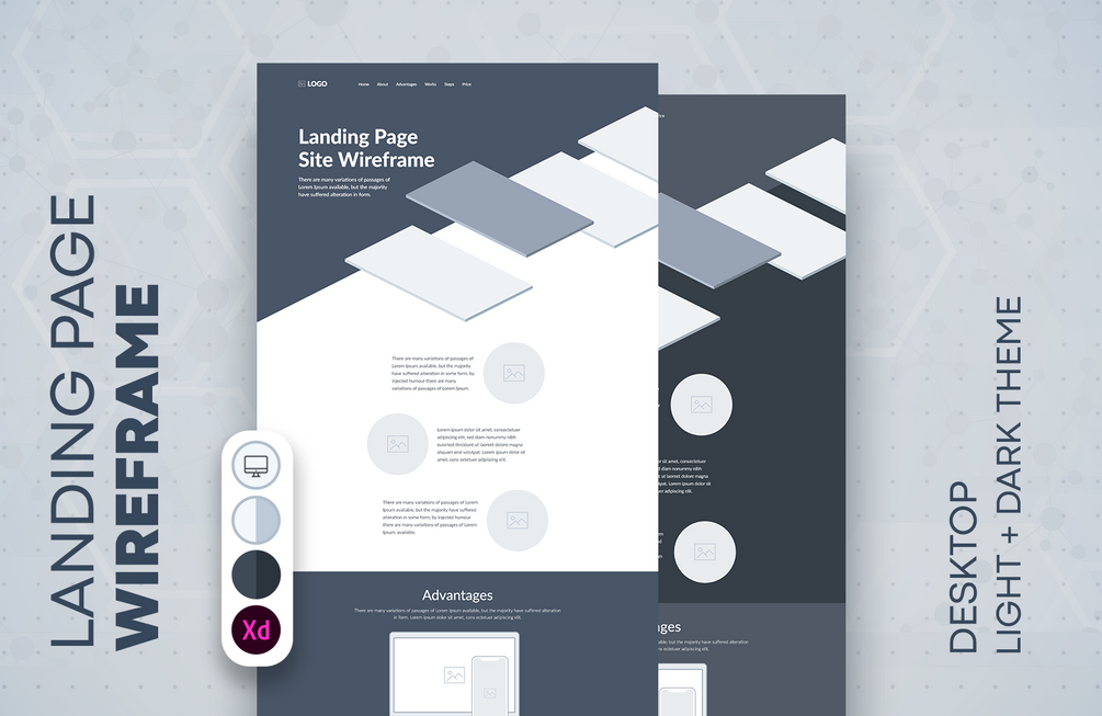 Landing page wireframe design. Desktop option. Light and Dark theme.