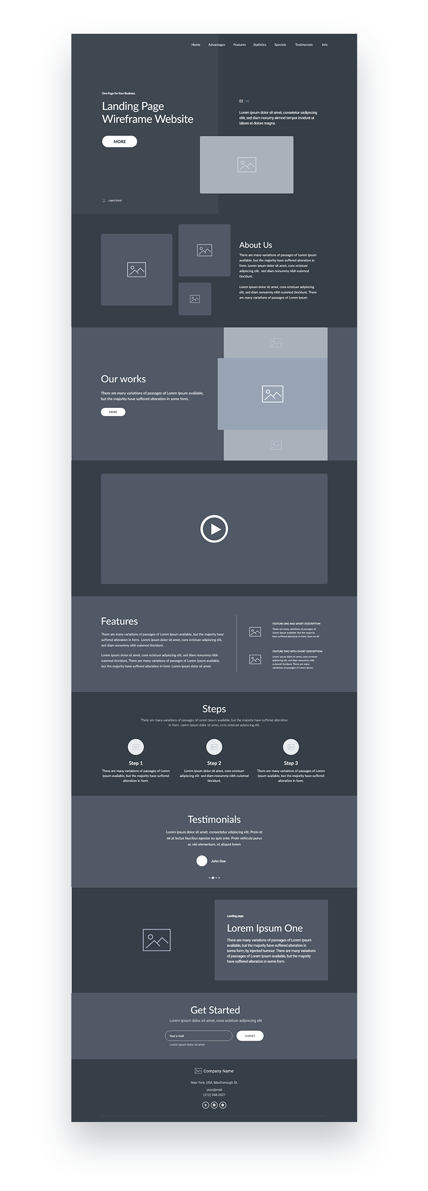 Wireframe landing page design. Desktop light and dark themes. One page website layout template.