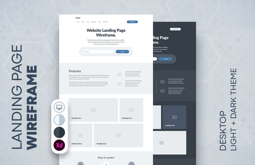 Wireframe landing page design. Desktop light and dark themes. One page website layout template.