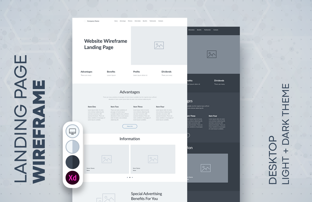 Landing page wireframe template for business. Flat modern responsive design. Desktop light and dark themes.