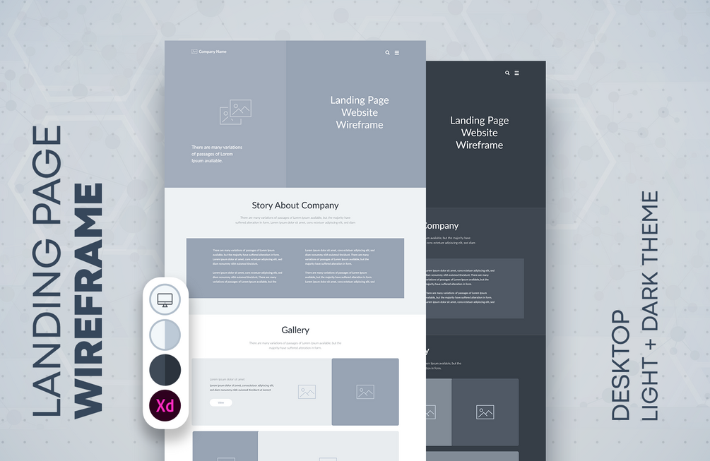 Landing page wireframe template for business. Flat modern responsive design. Desktop light and dark themes.