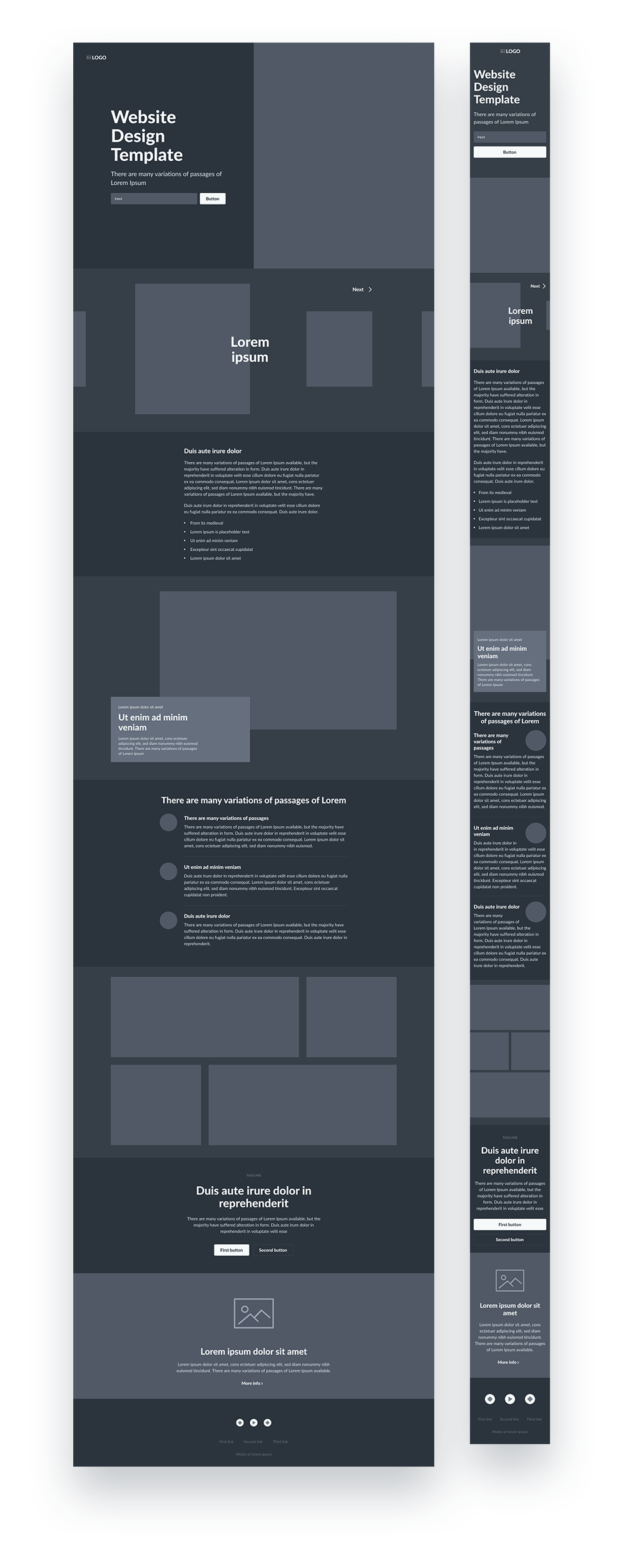 Landing page wireframe. Desktop and mobile templates. Flat modern responsive design. Light and dark themes.